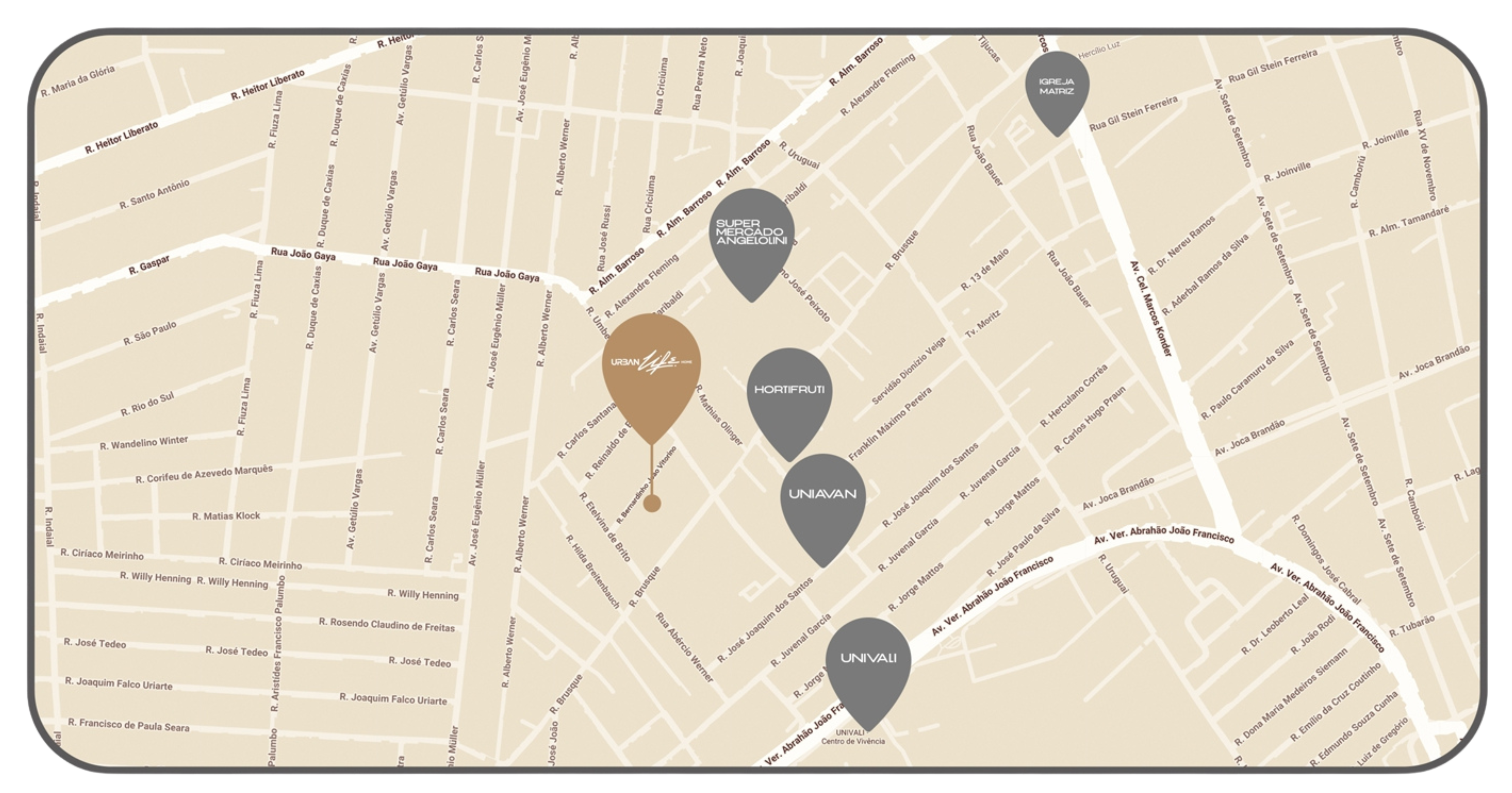 Situado próximo ao centro de Itajaí, o Urban Life Home permite viver com tranquilidade e acesso rápido a tudo o que você precisa: escolas, mercados, farmácias, comércio e vias principais da cidade.